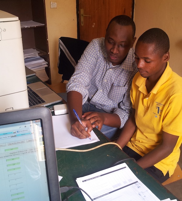 | Desire (left) working with Gishari’s IT manager, training on system use and administration |
